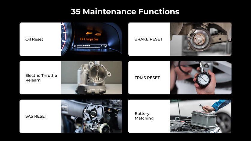 A comprehensive coverage of 35 maintenance services to cover essential tasks such as Oil resets, EBP resets, Suspension resets, and more. Additionally, it offers support for specialized functions within specific systems, including Add/Replace Key Fobs, Battery Sensor Module learning, and Tire Pressure Sensors Learning.